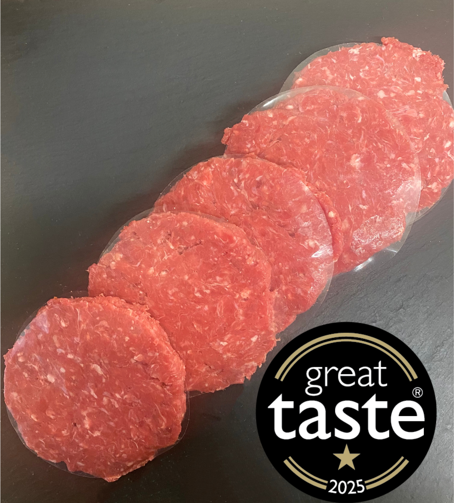 "A very pleasing looking burger, with a lovely handmade feel. It has a nice dense texture with a good meaty aroma. On the palate, this delivers a really pleasing eat. It is well seasoned and the cooked texture of the meat offers a very satisfying experience. The meat is not over processed, and there is enough fat in it to support the flavour of the meat. Delicious and well done." - Great Taste Judge's